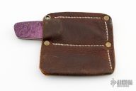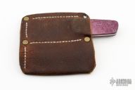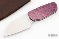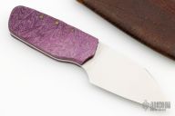 This Guppy by Transparent features a blasted wharncliffe blade with .083" blade stock and 1.054" blade depth, full tang construction. The handle has sculpted purple g10 scales with black g10 liners. Includes leather front pocket sheath with clip. Has a couple light scratches, otherwise excellent condition.