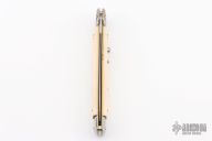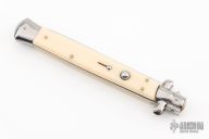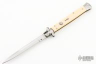 This 13" swivel bolster features a polished dagger ground blade. The handle has stainless steel bolsters, front and rear, Imitation Ivory scales, brass liners, stainless spring. Excellent condition. Comes with original box and sheath.