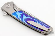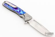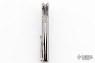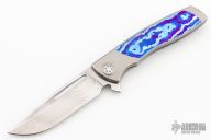 This Mini EVO Flipper from Brian Nadeau features a polished Damasteel blade with a fullers, thumbhole, flipper and notched thumbrest. The handle is comprised of a bead blasted titanium frame with Timascus inlays, satin titanium tip up clip. Rides on bearings, nice detent, lockup and blade seating, stainless lockface insert. Includes the original box. Excellent condition.