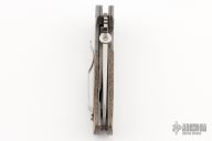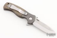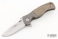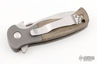 This Custom Mini Sheepdog by Ernie Emerson features a satin finished blade with flipper tab, thumbdisc, notched thumbrest and wave feature. The handle is comprised of bead blasted and dovetailed titanium bolsters, green canvas micarta scales over titanium liners with matching barrel spacers and tumble stainless steel tip up pocket clip. Nice action, detent and blade seating. Includes original box. Has been resharpened, has a few scratches and scuffs, otherwise good condition. We have been told this is the one and only mini sheepdog custom.