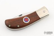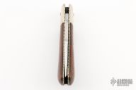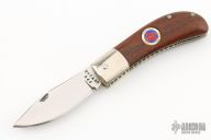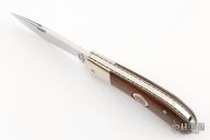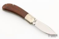 This slipjoint by Rob Davidson was made for the "TKCA" in 1990, it features a mirror finished blade with nail nick. The handle has dovetailed nickel silver bolsters, cocobolo covers, fileworked nickel silver liners and a stainless steel spring. Has a few very light scratches, otherwise excellent condition. #046