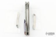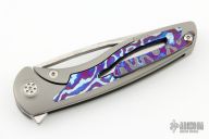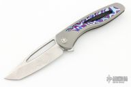 This Apex Flipper from Brian Nadeau features a Damasteel blade with a thumbhole, flipper and notched thumbrest. The handle is comprised of a grey titanium frame with Timascus inlays with a matching tip up clip. Rides on bearings, nice detent, lockup and blade seating, stainless lockface insert. Comes with original box and papers. Excellent Condition.