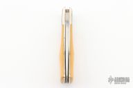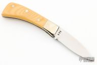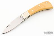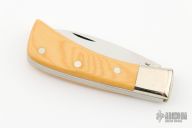 This slipjoint by Ron Little features a mirror polished blade with nail nick. The handle has nickel silver bolsters, yellow paper micarta covers, nickel silver liners and stainless steel spring. #121. Excellent condition.