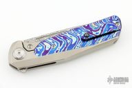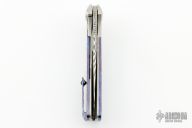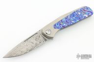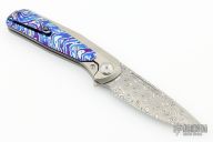 This GSD, by Liong Mah, features a Damasteel blade with a notched thumbrest and flipper. The handle is composed of an orange peel finished titanium frame with Mokuti scales and a matching tip up pocket clip.  Nice detent, lockup and blade seating. Includes a padded case.  Excellent condition.