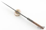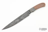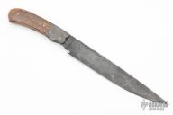 This knife by Master Smith Rick Dunkerley features a Damascus drop point blade with a file worked full tang construction.  .205" Blade Stock.  1.324" Blade Depth.  The handle has Damascus bolsters and mammoth ivory scales.  Includes a padded zippered case. Excellent Condition.