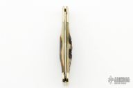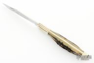 This Ka-Bar slipjoint is dated 1981. It has a mirror polished blade with nail nick. The handle has nickel silver bolsters, stag scales, brass liners, and stainless steel spring. Excellent condition. #7422