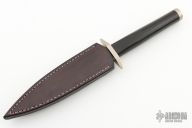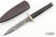 This Boot Knife by Ray Coon features a Damascus blade with .190" blade stock and .778" blade depth, hidden tang construction. The handle has a nickel silver guard and pommel with a wood grip. Includes leather sheath and a padded zippered case. Excellent Condition.