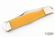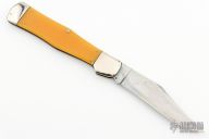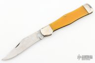 This "Olcut" slipjoint by Union Cutlery Company features a satin finished blade with nail nick. The handle has nickel silver bolsters, yellow celluloid covers, brass liners and steel spring. Has some scratches and patina, otherwise good condition for its age.