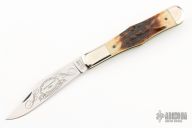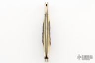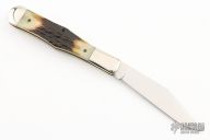 This Ka-Bar slipjoint is dated 1981. It has a mirror polished blade with nail nick. The handle has nickel silver bolsters, stag scales, brass liners, and stainless steel spring. Excellent condition. #5174