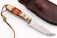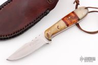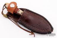 This hunter by Terry Treutel features a satin finished blade with fileworked thumbrest, .127" blade stock and .825" blade depth, full tang construction. The handle has sheeps horn scales with wood spacer, brass and wood liners. Comes with a brown leather sheath. Has some scratches, has been resharpened, otherwise good condition.
