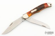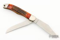 This Slipjoint from Schrade Cutlery features two satin finish clip point blades with nail nicks. The handle is comprised nickel silver double bolsters with stag covers over brass liners and stainless steel back springs. Lanyard hole in pommel. Some patina on bolsters and liners, but otherwise good condition. Includes leather sheath with belt loop.