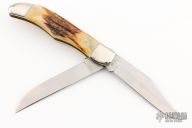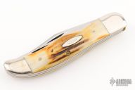 Vintage Case 5265 is a two blade slipjoint with stag handles and nickel silver bolsters. Has some light scratches and patina, otherwise good condition for its age. Comes with a brown leather sheath.