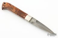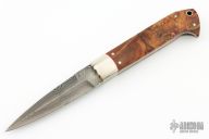 This knife features a Damascus dagger blade with a false top edge, .140" blade stock and .809" blade depth, full tapered tang construction. The handle has nickel silver bolsters, wood scales and red liners. Includes a padded zippered case.  This knife is marked, "New York #178".  Excellent Condition.
