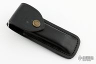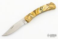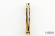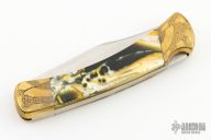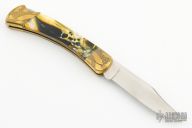 This Buck Model 110 was customized by "Wild Horse", it features a satin finished clip point blade with a single nail nick. The handle has engraved brass bolsters with integral liners and custom "Wild Horse Gold" acrylic scales. Includes a black leather belt sheath. Light scratches are visible on the blade and handle otherwise the knife is in good condition.