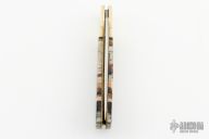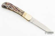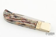This knife by Jerry Stone features a mirror polished blade with nail nick. The handle has nickel silver bolsters, mammoth tooth covers with scrimshawed mammoth ivory spacers, brass liners and stainless steel spring. Comes with a leather velcro pouch. Excellent condition.