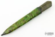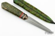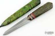 This Poker Ace Dagger by Anders Hogstrom features a double-edged 1050 carbon steel blade with beautiful hamon, .240" blade stock and 1.086" blade depth, hidden tang construction. The handle has a textured and antiqued bronze guard, red linen micarta spacer, beautiful old growth Red Oak grip with a super high gloss finish. Comes with a hand tooled green/black leather sheath and a velcro case. New from maker!
