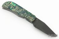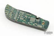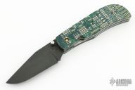 This linerlock by Jake Elenbaas features a parkerized 8670 Steel blade with single thumbstud. The handle has mother board scales, stainless steel liners and a black G-10 backspacer. Comes with COA. New from maker.