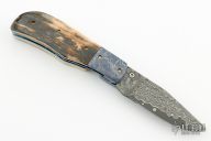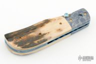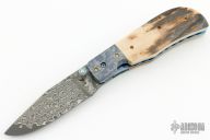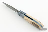 This knife by Jake Elenbaas features a clip point SS Damascus blade with single thumbstud with blue stone inlay. The handle has black G-10 bolsters, mammoth ivory scales, anodized titanium liners with jeweled interiors and a black G-10 backspacer. Nice lockup and blade seating. Comes with COA. New from maker.