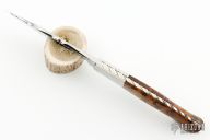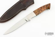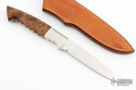 This hunter by Wolfgang Loerchner features a mirror finished blade with fileworked spine, .188" blade stock and .818" blade depth, full tapered tang construction. The handle has stainless steel bolsters, burl wood scales, fileworked tang. Comes with original black/brown leather sheath. Has some light scratches, otherwise excellent condition.