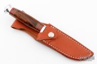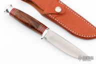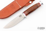 This Manitou by Bark River features a satin finished blade with false top edge, .157" blade stock and 1.110" blade depth, hidden tang construction. The handle has a polished aluminum guard and butt, desert ironwood grip with red/brass/black spacers. Comes with original brown leather sheath and box. Excellent condition.