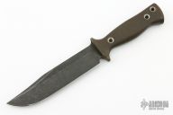 This Custom Stryker by Dan Tope features a dark stonewashed blade with false top edge, .152" blade stock and 1.245" blade depth, full tang construction. The handle has brown canvas micarta scales with hollow tube pins. Comes with original box. Excellent condition.