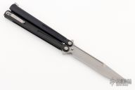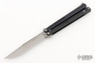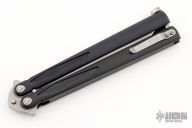 This Tachyon III balisong by Microtech Knives has a bead blasted blade with false top edge. The handles are integral black aluminum with spring latch and tip up stainless steel clip, all blasted hardware. Dated 07/2017 and s/n 02060. Includes the original box and papers.  Excellent Condition.