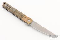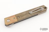 This Burnley Designed Kwaiken flipper (#0462) has an VG-10 steel up-swept satin finished blade with swedge and IKBS bearings. Has brass bolsters, micarta scales, titanium liners and a brass backspacer. Includes the original box and papers.  Excellent Condition.