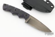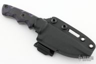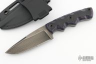 This knife by Tim Kell features a milled blade with .169" blade stock and 1.141" blade depth, full tang construction. The handle has black/purple G-10 scales. Comes with original kydex sheath. Has a little oxidation on the edge, otherwise excellent condition.