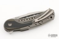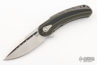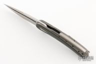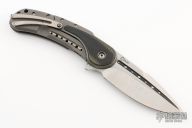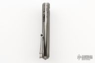 This Bodega flipper by Todd Begg Knives features a satin finished blade with a false top edge. Bead blasted titanium frame with green/black g10 inlays with cracked ice finish titanium backspacer, tip up pocket clip and pivot collar. Includes IKBS (Ikoma-Korth Bearing System) for smooth and fast opening that requires no wrist action. Outstanding work. Comes with a zipper case. Has some scuffs on the frame, otherwise excellent condition.