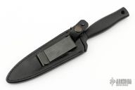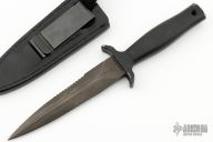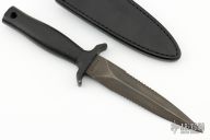 This Mark 1 dagger by Gerber has a black double edged blade with partial serrations, .246" blade stock and .954" blade depth, hidden tang construction. Black coated aluminum handle. Comes with a black leather sheath with boot clip. #P4713S. Has some scuffs/scratches otherwise the knife is in good condition.