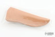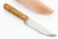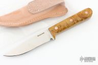 This Bushcrafter by Brad Shroyer features a satin finished blade with .135" blade stock and 1.144" blade depth, full tang construction. The handle has Myrtle Burl scales with orange G-10 liners. Comes with a brown leather sheath. New from maker!