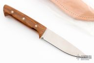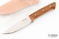 This Hunter by Brad Shroyer features a satin finished blade with .138" blade stock and 1.140" blade depth, full tang construction. The handle has Cherrywood scales with orange G-10 liners. Comes with a brown leather sheath. New from maker!