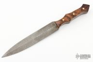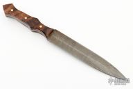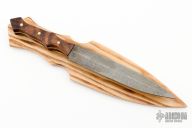 This Dagger by DV Customs features a double-edged Damascus blade with a full tang construction .130" Blade Stock, 1.252" Blade Depth.  The handle has black walnut wood scales.  Including a magnetic wood wall mount.  S/N 203.  New from maker. Comes with COA.