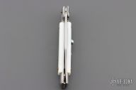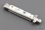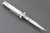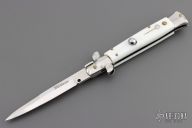 This 8.5" swivel bolster auto by "Milano" has a polisshed blade, stainless steel bolsters, acrylic scales and steel liners. Good function. Excellent condition. Comes with a nylon belt sheath.