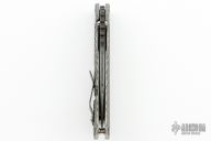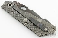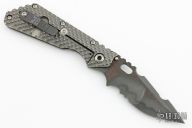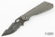 This Mick Strider custom SMF framelock folder has a Nightmare ground partially serrated blade with hamon, notched thumbrest and thumbhole. The handle has a double gunner grip titanium frame with laser engraved titanium clip. Includes Hinderer "Lock Bar Stabilizer" for maximum reverse lock retention. Nice lockup, blade seating and detent. Comes with zippered case. Excellent condition.