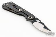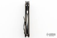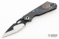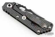 This SNG by Mick Strider features a pike ground partially serrated blade with a notched thumbrest and thumbhole and black textured flats. The handle has a flame finished titanium frame and tip up clip. Excellent Condition.  Comes with a zippered case.