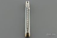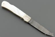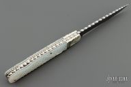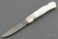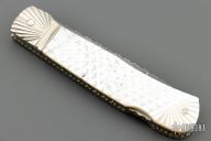 This Auto by Ken Steigerwalt features a Damascus blade with fileworked spine. The handle has scalloped and fluted nickel silver bolsters, fluted and checkered mother of pearl scales, fileworked nickel silver liners, fileworked stainless steel backspacer. Nice action, lockup and blade seating. Excellent condition.