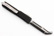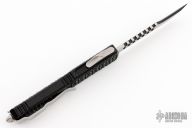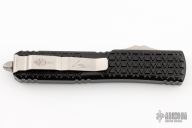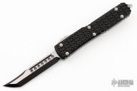 This Ultratech Hellhound by Microtech Knives features a two-tone black DLC blade with notched thumbrest and fullers, false top edge. The handle has a Tri-Grip black aluminum frame with tip down blasted stainless steel clip, blasted hardware, blasted thumbslide. Comes with original box and papers. Excellent condition. Dated 05/2023 and s/n 031