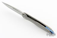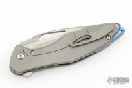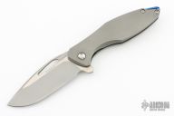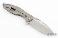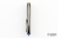 This Arius Flipper by Koenig knives features a burnished with PF blade with thumbhole and flipper. The handle has a bead blasted and C-pattern milled titanium frame satin titanium backspacer and a bead blasted tip up clip with hidden screws. Has ceramic bearings and a ceramic detent ball. Nice detent, lockup and blade seating. GEN4B1. Has a couple light scuffs, otherwise excellent condition.