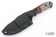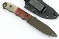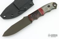 This Disaster Breacher Jr by Half Face Blades features a cerakoted drop point blade with a full tang construction.  .159" Blade Stock.  1.228" Blade Depth.  The handle has ironwood, buffalo horn and red trustone scales. Comes with a kydex sheath. Excellent Condition.