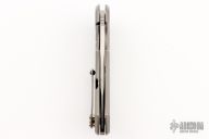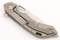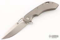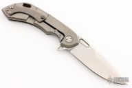 This Wayfarer 247 from Olamic Cutlery features a satin finished blade with swedge, thumbhole, notched thumb rest and flipper. The titanium handle scales are bead blast finished titanium with a matching pocket clip is positioned for tip up carry with a ceramic ball inlay, floating titanium backspacer. The Wayfarer 247 is very comfortable in the hand and flips well with no wrist action needed. Blade is centered when closed and locks up with no play. T055 on the backspacer. Has a couple light scuffs, otherwise excellent condition.