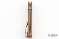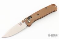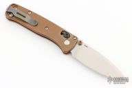 The Mini Bugout features a drop point blade with stonewash finish. It's a manual opener with ambidextrous copper thumb studs. This AXIS lock has a custom copper frame and black hardware, dark stonewash deep-carry pocket clip, and a lanyard hole. Has patina, and a couple scratches on the blade. Great condition otherwise.