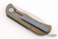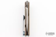 This EXK SFL from Burger Knives features a hand rub satin finished drop point blade with notched thumbrest and front flipper. The handle has an anodized and bead blasted and milled titanium frame with anodized tip up clip and backspacer. Excellent Condition.