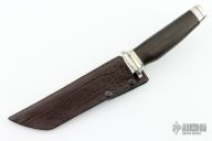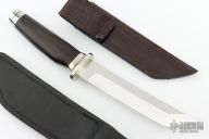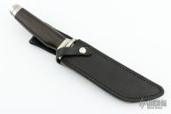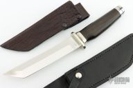 This Tanto by Larry Mensch features David Boye's Dendritic Cobalt, it features a polished tanto blade with .130" blade stock and 1.209" blade depth, hidden tang construction. The handle has a nickel silver guard and butt with a wood grip. Comes with a black leather sheath, a leather covered kydex sheath and a Maxpedition zippered case. Has a very small crack running the length of the grip, otherwise excellent condition.