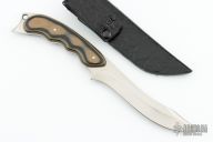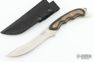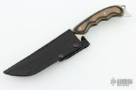 This knife by On Point Knives (Larry C. Mensch and Craig B. Hulet) features a hand rub satin finished blade with sharpened top edge and notched thumbrest, .159" blade stock and 1.269" blade depth, full tang construction with tan/green/black G-10 scales, lanyard hole at the butt. Comes with a black leather covered kydex sheath and a nylon zippered case. Has a few light scratches, otherwise excellent condition.