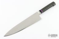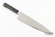 This Chef's Knife by David Boye is a Larry Mensch design, it features a satin finished dendritic cobalt blade with .211" blade stock and 2.224" blade depth, integral bolsters with hidden tang construction. The handle has a black linen micarta grip with black and purple stone spacers. Comes with a zippered case. Has a few light scratches, otherwise excellent condition.