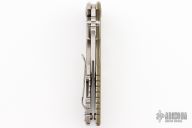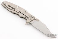 This Eklipse by Hinderer Knives features a stonewashed blade with dual thumbstuds, flipper and notched thumbrest. The handle has a tumbled titanium frame and a textured green G-10 scale. Nice detent, lockup and blade seating. Excellent Condition. Comes with Hinderer box and extra hardware.