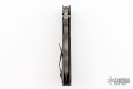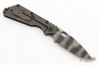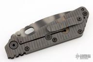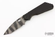 This MSC SMF framelock folder by Mick Strider features a tiger striped tanto blade and a dimple pattern black aluminum and flamed titanium frame and tip up titanium clip. Includes Hinderer "Lock Bar Stabilizer" for maximum reverse lock retention. Nice detent, lockup and blade seating. New condition.