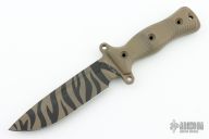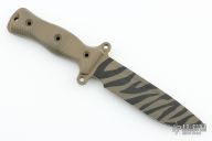 This Team Gemini "M" by Busse features a tiger stripe coated drop point A2 blade with fullers, .256" blade stock and 1.598" blade depth, full tang construction. The handle has green G-10 scales, extended tang with lanyard hole. Excellent condition.