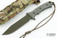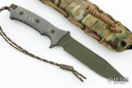 "Continuing the proud tradition of Chris Reeve Knives honoring elite military, the Reeve/Harsey collaboration - the Pacific - is the civilian version of a knife created to celebrate the 50th Anniversary of 1st Special Forces Group. Based in Ft. Lewis, WA, 1st Group's theatre of operations is Asia and the Pacific, so the name Pacific has been chosen to honor the home and work place of these fine soldiers." This knife has a clip point OD Green blade with .222" blade stock and 1.396" blade depth, full tang construction with black canvas micarta scales. Comes with camo nylon spec-ops sheath. Comes with original box and papers dated May 16, 2023.  New condition.